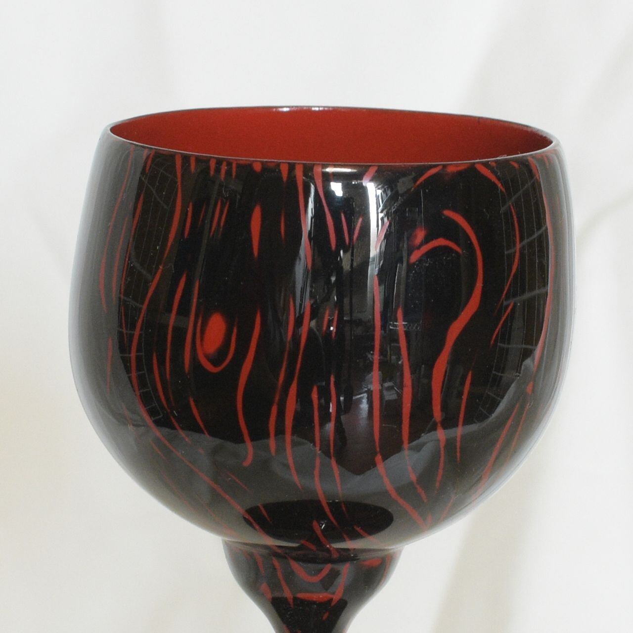 朱地には黒い流紋、黒地には朱色の流紋で飾ったゴブレットです。この流紋は、研ぎ出しの漆絵で描いてあります。これは、まず漆で描いた文様を別の色の漆で塗り込め、後にその模様を研ぎ出しています。表面に描いただけの模様と違い、研ぎ出しの効果で偶然の面白さが加味されています。