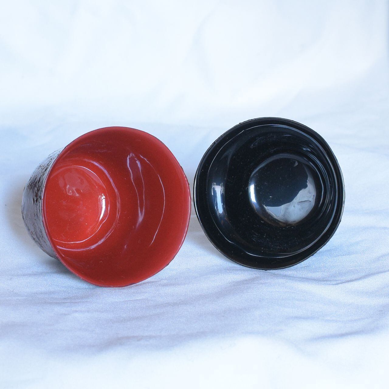 漆で貼り着けた真綿の繊維の凹凸に銀粉をまぶし、溜塗にしたぐい呑みです。