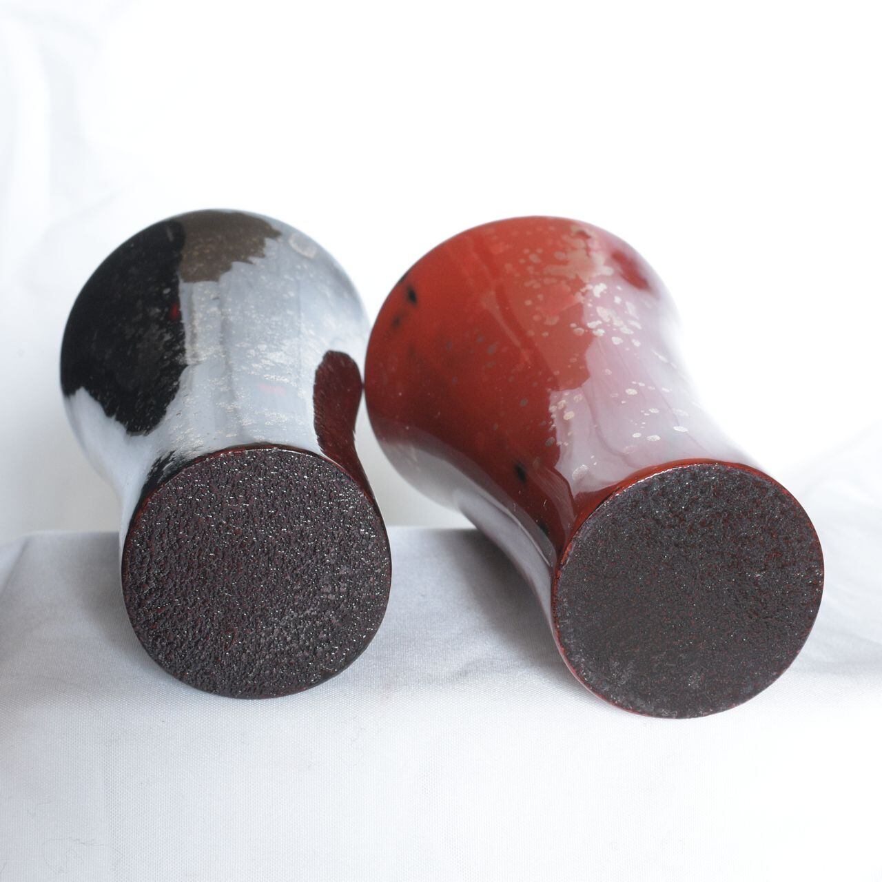銀の研ぎ出しで飛沫のような模様を施したタンブラーです。黒の上塗りでは下塗りの朱色が、朱色では黒が、所々見えているのがアクセントになっています。