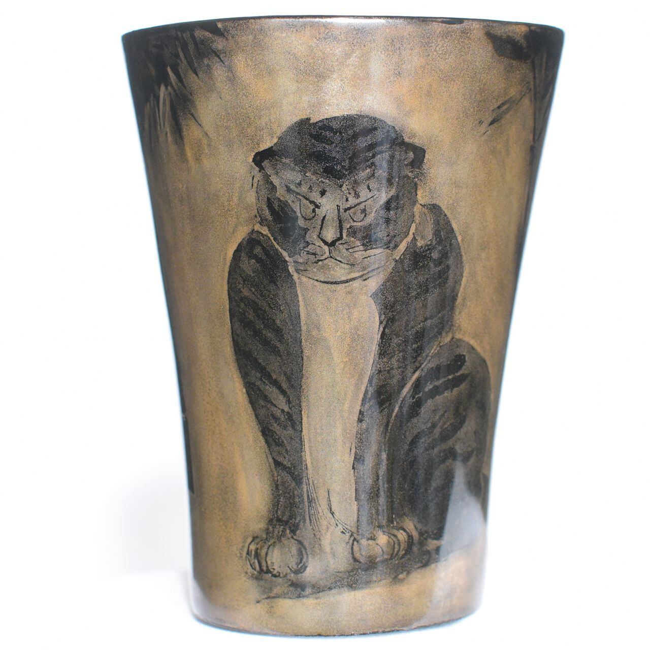 銀の研ぎ出し蒔絵で尾形光琳の”竹虎図”を描いたタンブラーです。表面に漆を薄く塗って古色を出して有ります。